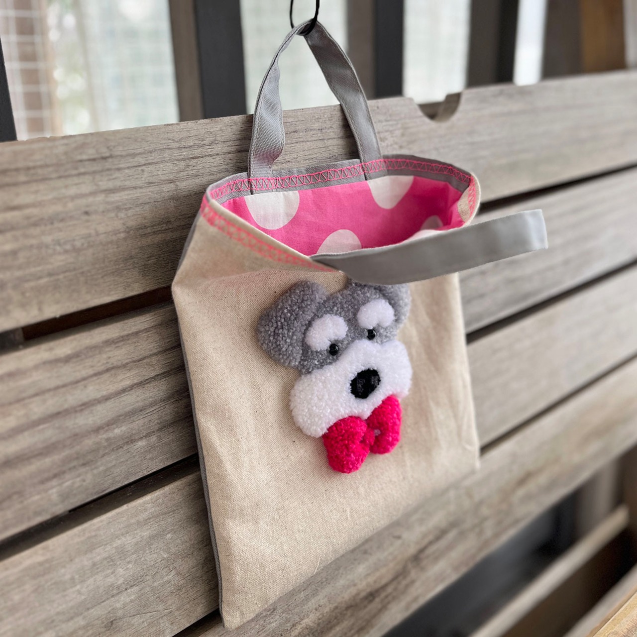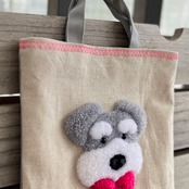 表生地に直接刺繍(フリーステッチングニードル)でシュナちゃんを入れてからバッグに仕立てております。